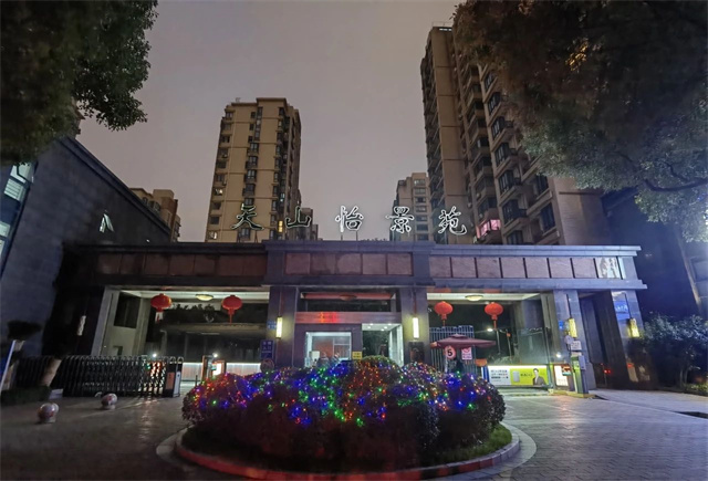 夜幕降临,门口高高挂起的大红灯笼与绿植花卉上点缀的五彩斑斓的彩灯相互衬托,为小区增添了一份喜气。