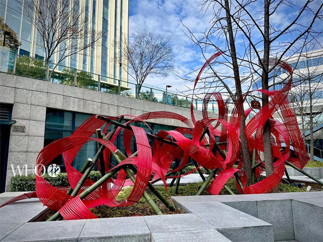 红色在中国文化中象征着喜庆和繁荣,寓意着事业蒸蒸日上。虹桥国际商务花园二期的下沉广场,一个名为“潜龙腾跃”的景观正如同一团热烈的火焰般燃烧。