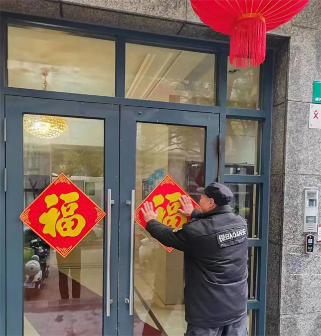 与此同时,天山怡景苑的物业办公室里,红色的灯笼铺满了空间,工作人员们也正忙着给各楼栋悬挂灯笼、张贴“福”字,小区的年味悄然铺开。