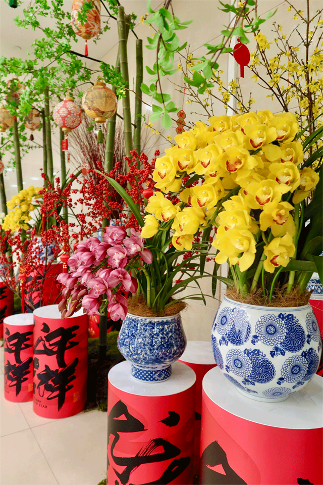 花卉、灯笼、绿竹、春联……虹桥国际商务花园一派春意盎然、万象更新。色彩丰富、喜庆美好的新春美陈悄然亮相,白领们工作之余,纷纷放慢节奏,感受新春年味。