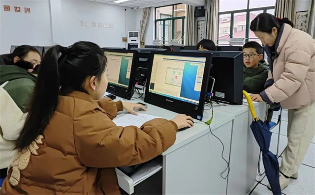 新泾中学的电脑机房内,沪剧社团学生徐天依正用打谱软件制作沪剧唱段《红梅赞》的乐谱。在下学期的开学典礼上,她将为师生们带来这首作品的沪剧演唱。电脑前一字一句的打谱,让她对于作品的旋律、节奏更加熟悉。
