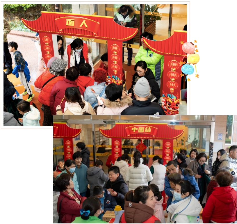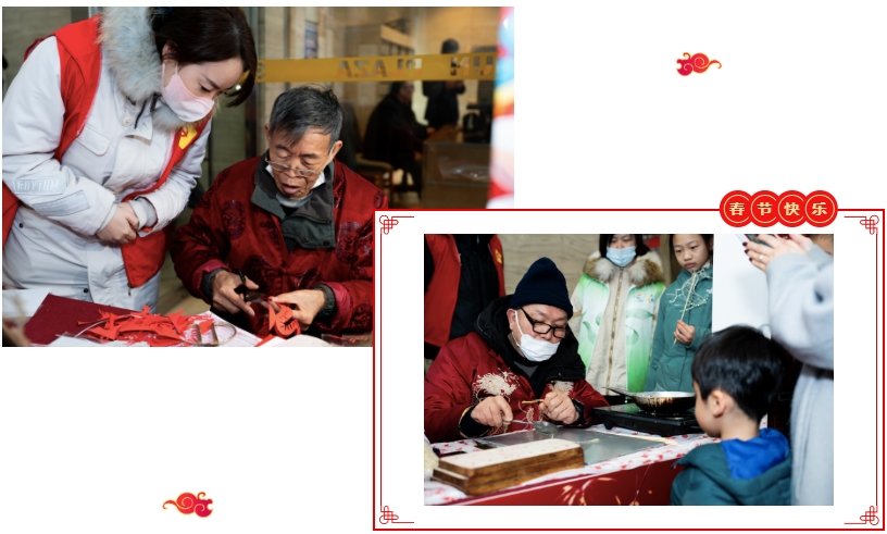在大厅里,各种新春装扮,红彤彤的格外喜庆。以非遗年俗为主题的集市摊位整齐排列,吉祥的中国结编织、喜庆的剪纸送福、颇受欢迎的书法春联……丰富多彩的民俗活动,让居民们近距离感受传统文化的魅力和极具特色的“年味餐”。