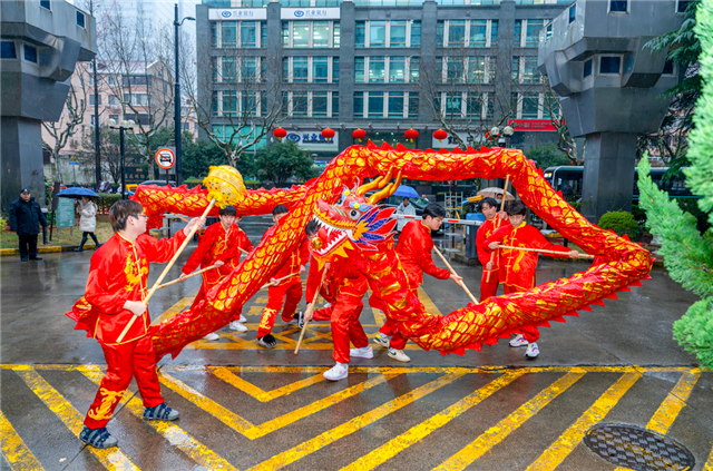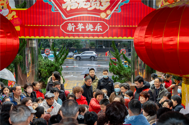 伴随着锣鼓声,一条“巨龙”在广场上时而“飞冲云端”,时而“入海破浪”,瞬间点燃市集的年味氛围。