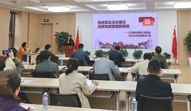评审会上,各居民区代表围绕市级民主法治示范社区建设规划及成果情况进行汇报、交流,如“五民”工作法、“1+4+X”九日议事会、“七彩家园”集结号、“久久乐”议事厅、“同心树”工作法等,展示出极具辖区特色的基层依法治理经验和做法。