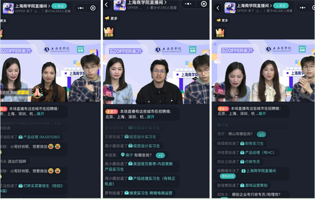 “哪些职场礼仪是需要我们去注意的?”“如果被企业录用,与企业签订书面劳动合同时需要注意哪些事项?”……通过直播互动弹幕,主播和嘉宾能够及时了解同学们实时关注的问题并及时解答反馈,为大家创设更精确、更便捷、更智能、更高效的线上环境与直播体验。来自瓴寓国际、中贸国展企业高管、上海商学院校友代表、毕业生代表作为现场嘉宾,还为同学们介绍起行业前沿动态、解读招聘信息内涵、分享自身职业成长经历、交流自己求职准备。