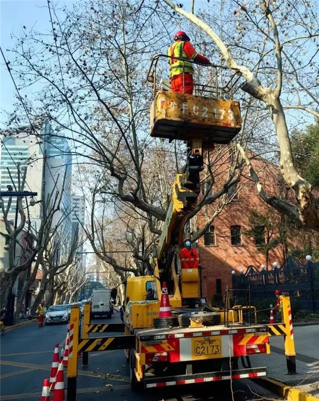 除了物理吹冲,防治悬铃木果毛“撒欢”的主要手段还有在冬季提早修剪。通过修剪可以很好地减少果球的产生。采用“开心型”修剪手法,大约可以修除90%的果球。近几年推广机械化作业,长宁通过采用登高车,对大型、超大型悬铃木顶部果球枝进行修剪,可以做到精准修剪防控。