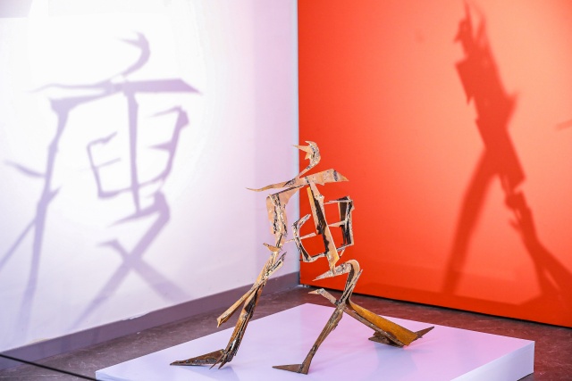艺术家麻进以灯光和书法艺术结合创作的装置《瘦人》,将瘦金体书法以现代手法展现,不仅充满新意,更成为现场许多年轻人的热门拍照打卡作品。青年艺术家孙元结合中国炒茶人的形象,将中国书法和具有力量感的美式漫画相结合,创作的《市井十二》,犹如中西方文化碰撞出的一次精彩冒险。