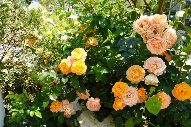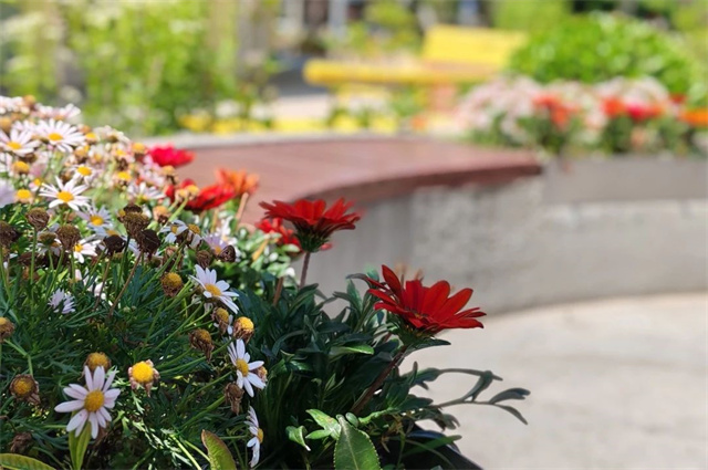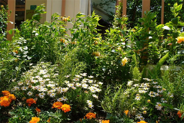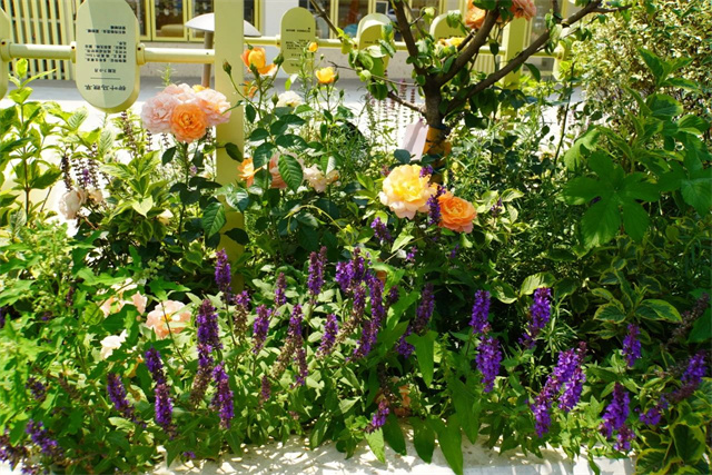 花池中,各类芳香花草在阳光下竞相绽放,