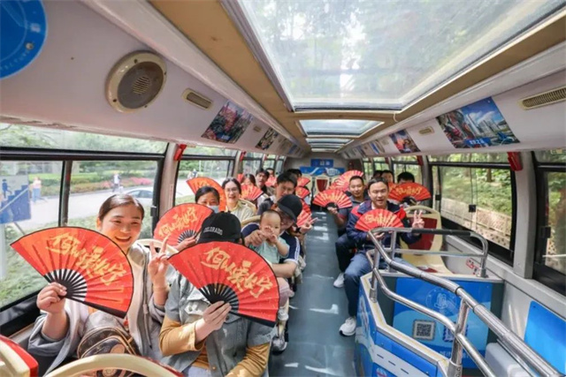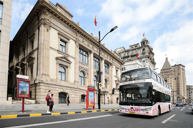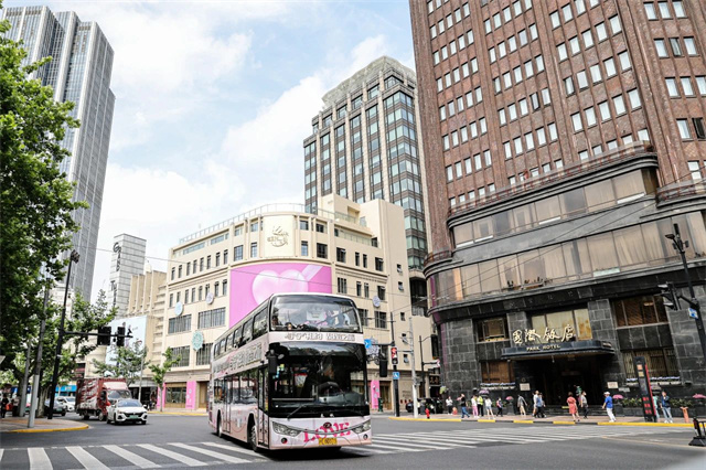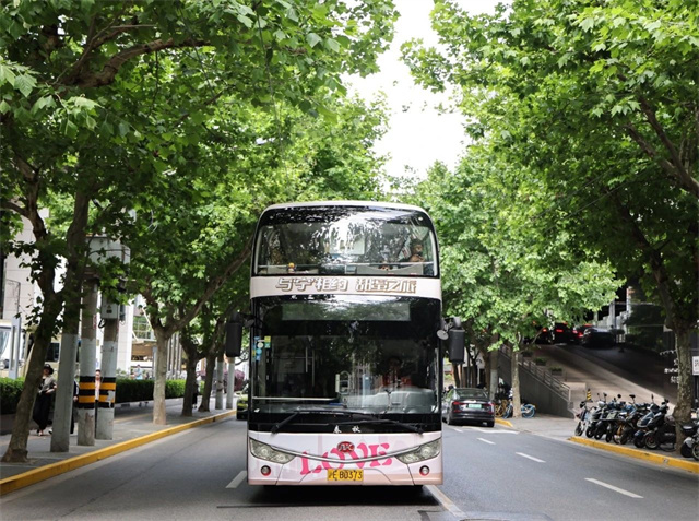 上午9点,一辆贴有“与宁相约 甜蜜之旅”的“何以爱长宁”粉色双层巴士,从春秋国际大厦缓缓驶出。