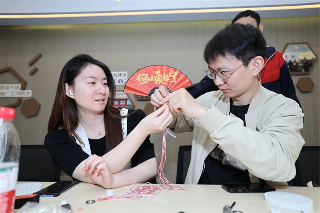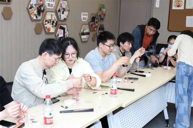 微旅行的最后一站,来到了新华路街道社区党群服务中心。大家在老师的指导下,采用绳编的方式,亲手用玉线、金银线、股线等各种材质的线绳,编织出了心心相印的手绳。