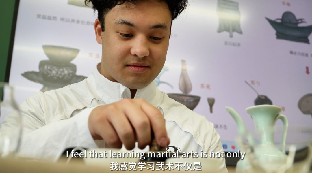 Training hard at school is a "daily routine" for Elijah. Firstly, he usually does warm-up exercises and some basic movements to follow the teacher, and then sword training, Taiji practice... He was so excited to learn new martial arts moves in the class. Sometimes he plays shuttlecock with his classmates during the warm-up. Besides martial arts, he also enjoys many cultural activities in China. On this day, Elijah participated in dragon boat training and learnt how to pour tea at school.