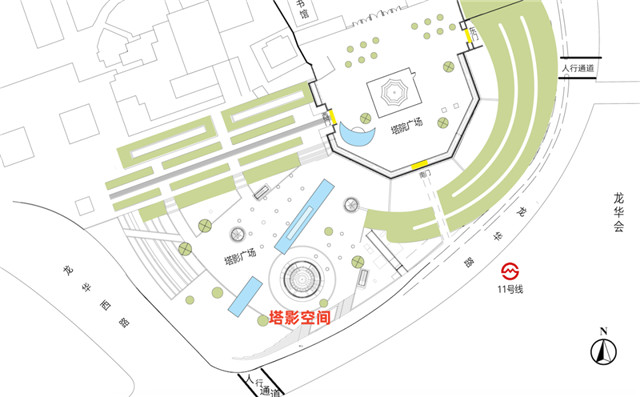 隐于塔院广场水域之下的塔影空间,别有洞天,是龙华地区一处备受市民游客欢迎的新晋人气“打卡点”,集阅读、休闲、艺术展示于一体,由“塔影”“归云”“听松”“迎月”四个功能区域组成。