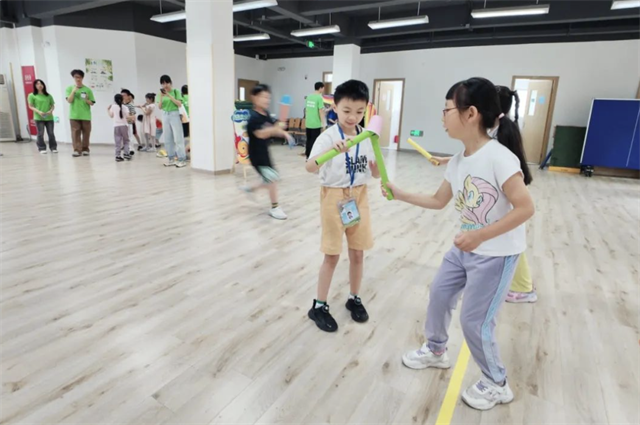 上午9点,天山路街道“追光少年‘暑’你行”爱心暑托班第一期的81位小学员齐聚新世纪中学室内活动室,跟志愿者老师进行拉伸热身运动后,准备在即将开始的比赛中大展身手。