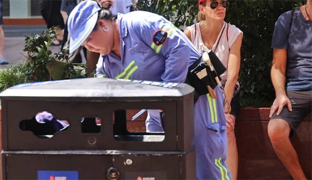 “夏天高温,天气炎热。很多游客会购买防暑降温的奶茶饮料、冰淇淋雪糕,容易打翻在地,高温照射也很容易融化,于是马路上就比较容易结成黏糊糊的污渍。这时候,我们就要用上专用清洁剂,仔细处理掉这些污渍。经历后半夜的机器清洗路面后,相对来说,早上垃圾还算少,而且游客通常很文明,不太会乱丢垃圾。到了下午和晚上人流激增,工作量也会进一步提升。”以韦素素的早班为例,以前捡拾垃圾用小桶装就行,而最近基本装不下,要改用大的塑料袋。
