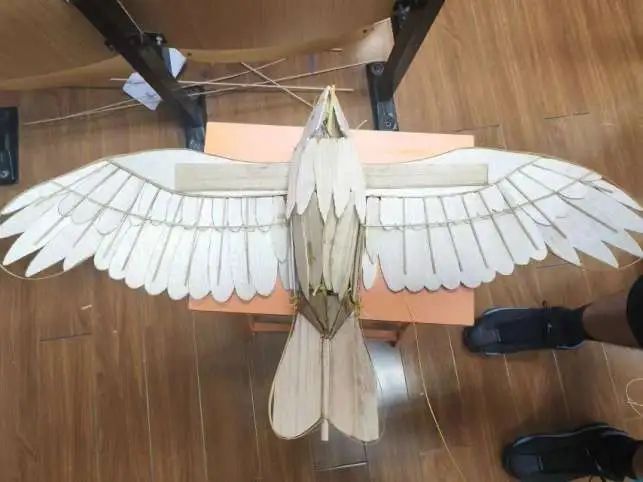 在制作环节中,团队严格遵循春秋时期的实际制作工艺,选用了竹片、轻木、乳胶、麻线等原生态材料。经过冷水浸泡、增韧、烘烤箍出轮廓、麻线固定骨架、粘贴主羽和纤羽等一系列复杂工序后,一只翼展1.2米、身长0.9米、重300克的纯竹木结构木鸢终于大功告成。