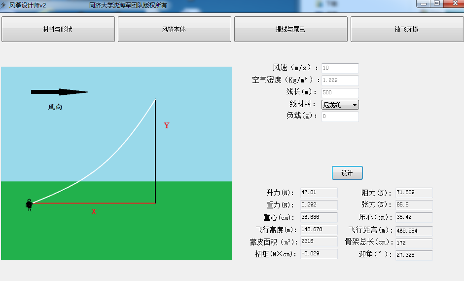 为了减小失败风险,团队还使用了同济大学航空与力学学院教授、飞行器工程研究所所长、博士生导师沈海军开发的“风筝设计师”软件,对木鸢的设计方案进行了模拟和仿真。该软件能够模拟各种风筝在不同飞行环境下的气动力学性能参数及飞行状态,为团队提供了详尽的性能数据支持。通过软件的帮助,团队优化并确定了木鸢缰绳与放飞线的长度,以及缰绳节点的最佳选取位置,从而大大提升了木鸢的制作精度和飞行性能。