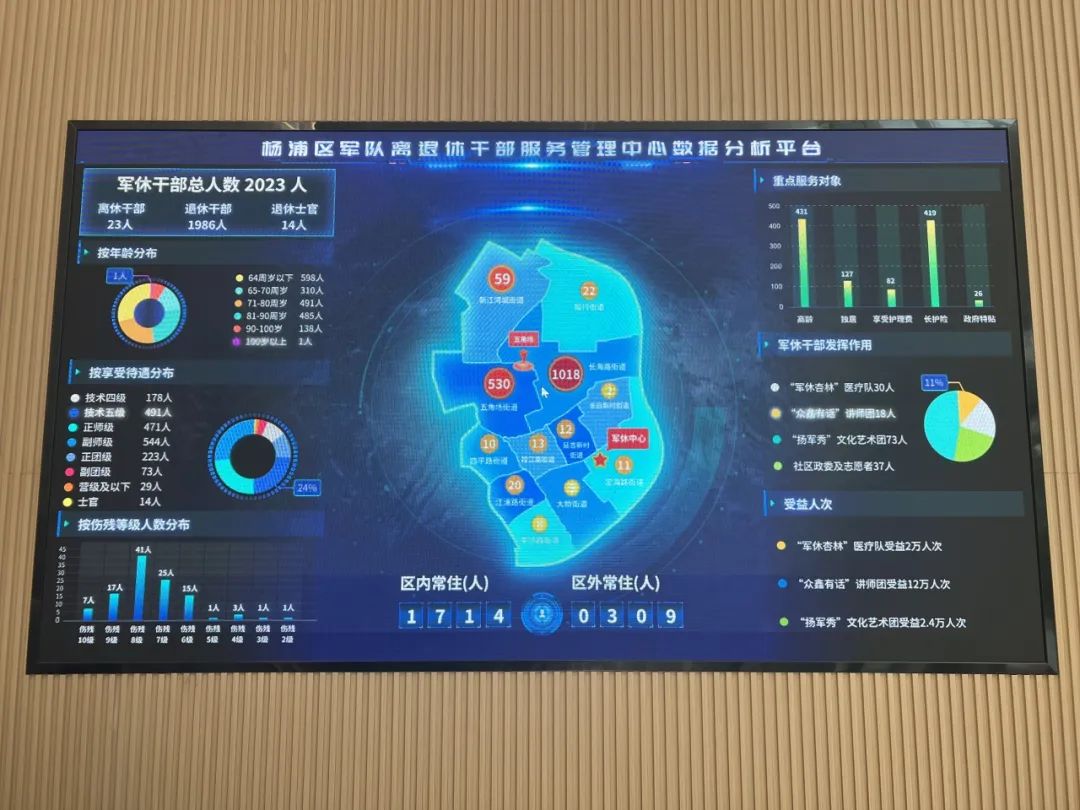 走进“新中心”,一楼大厅宽敞明亮,军休中心管理数据实现“一屏通览”,对服务军休干部总数、常住地、文艺团队参与情况等进行综合分析,以便为军休干部提供精准化、细致化服务。
