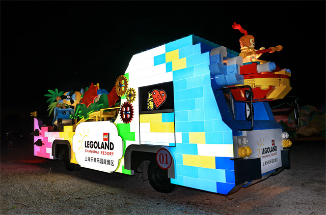上海乐高乐园花车由放大25倍后的乐高积木砖块拼搭而成,通过精心设计和创意表达,让市民游客对乐高悟空小侠(上海乐高乐园度假区将全球首发“悟空小侠”主题片区)、飞龙过山车等乐园项目先睹为快;
