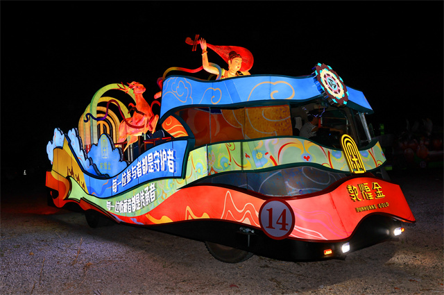 老凤祥2024“凤尚金潮”花车以以国家级非遗——老凤祥金银细工的精巧设计打造出炫彩凤尾的闪耀细节,通过LED动态灯光编程效果形成凤凰羽毛的流光溢彩飞舞特效;