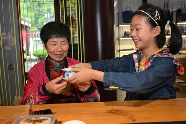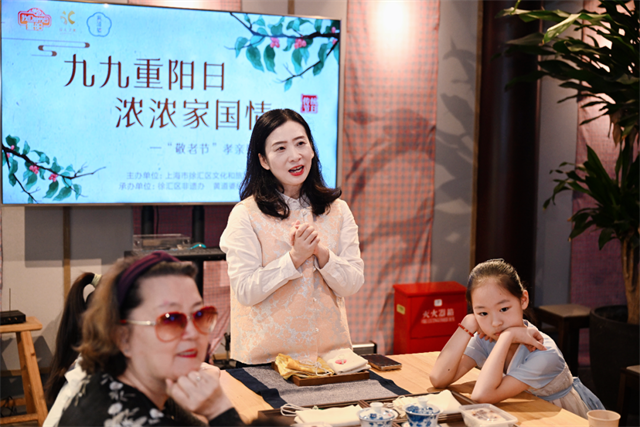 在精心布置的重阳场景中,一场名为《九九重阳日•浓浓家国情》的微讲座带领大家深入了解了中国传统重阳佳节的节俗文化演变与节日精神内涵。在菊花茶香与重阳诗词的诵读声中,祖孙共同品鉴重阳糕,插重阳旗,并由孙辈向长辈行敬茶礼。