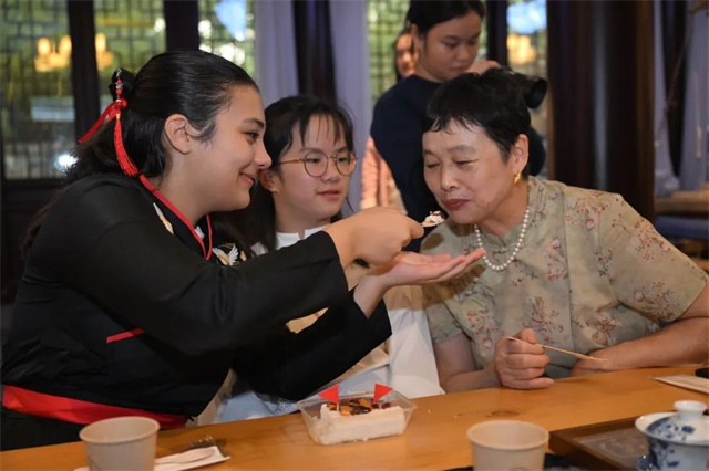 活动现场一组中意组合的家庭也格外温馨。来自意大利的交换留学生华思宇来到上海,受到中国家庭无微不至的照顾,这次她和中国妹妹华思齐一同为奶奶献上了甜甜的重阳糕,在活动中感受到中国独特的孝亲敬老文化。