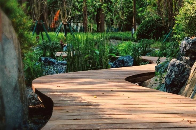 此次改造利用场地内的地形差,在林下增设一处雨水花园,雨水花园内的植物和土壤既能起到过滤雨水污染物的作用,也可以为鸟类和昆虫提供栖息地,创造出生境功效,保护生物多样性。此外,木栈道穿过雨水花园,也丰富了游览路径。