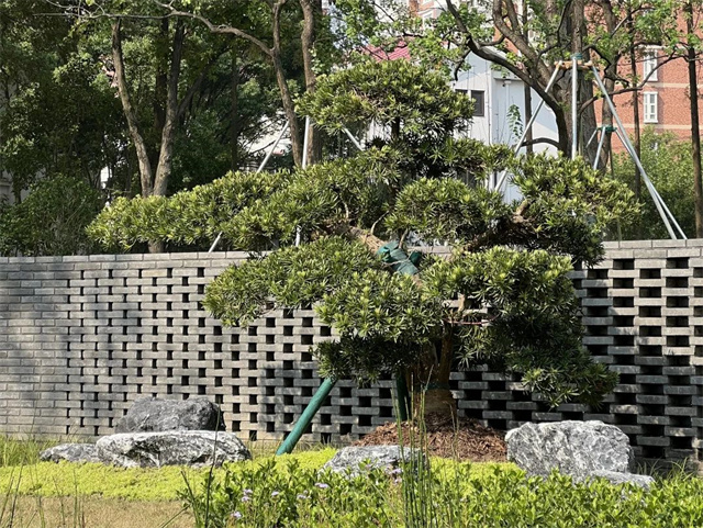 “明月松间照,清泉石上流”,松寓意坚韧不服输;“不经一番寒彻骨,怎得梅花扑鼻香”,梅寓意淡泊自守。清心圃以造型松作为主景树,搭配2株梅花及红枫,整体通过廊架与景墙对空间的围合,形成园中园。