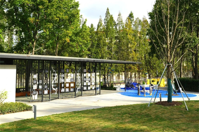 阳光草坪东侧设置科普廊架和儿童乐园,开阔视线及座椅设施让家长看护儿童玩耍更安心。科普廊架与街道共治,展示二十四节气推荐使用的中草药画作,让市民深入了解药用植物的科学知识,画作均由市民及学生手绘而成。
