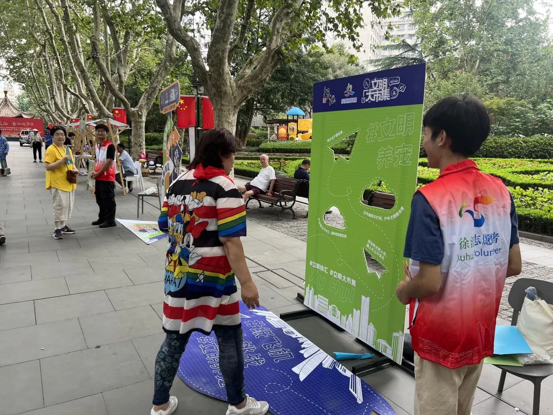 在“文明养宠”区域前,一位阿姨正聚精会神地凝视前方,右手上的纸飞机呼之欲出,一声“嘿”,纸飞机穿过了前方展板的洞口,飞向了远处,阿姨挑战成功获得了印章,开心之情溢于言表,她表示虽然只是个小游戏,但也体会到了她们儿时的快乐,同时也掌握了文明养宠的一些小知识。在“文明旅游”的“打卡”立牌前,居民们留下了自己的“文明宣言”,并合影留念。