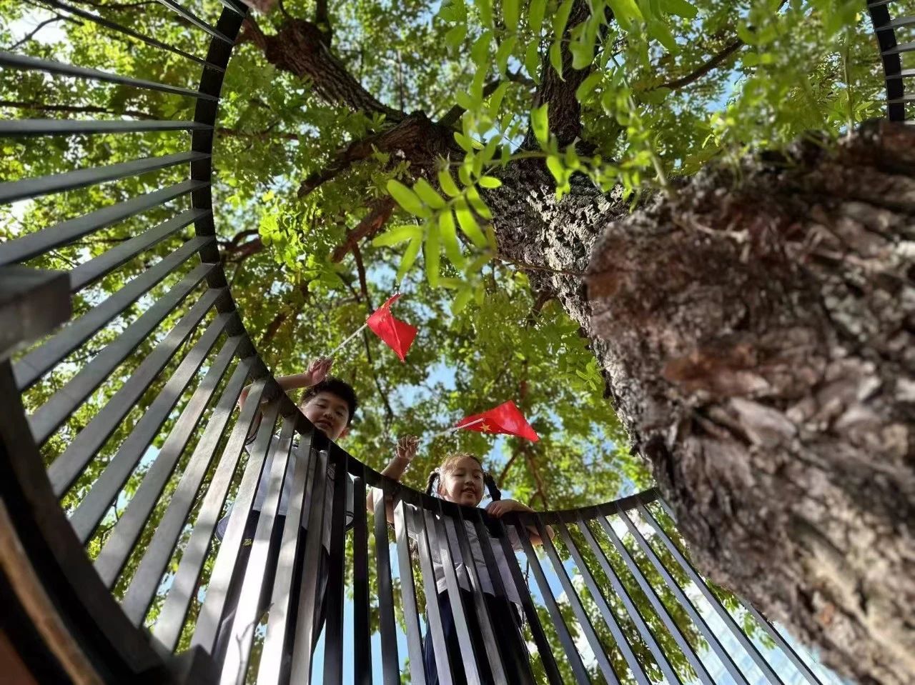 天一小学的孩子们举着国旗登上枫杨树,俯瞰沐浴在秋色中的天一校园。