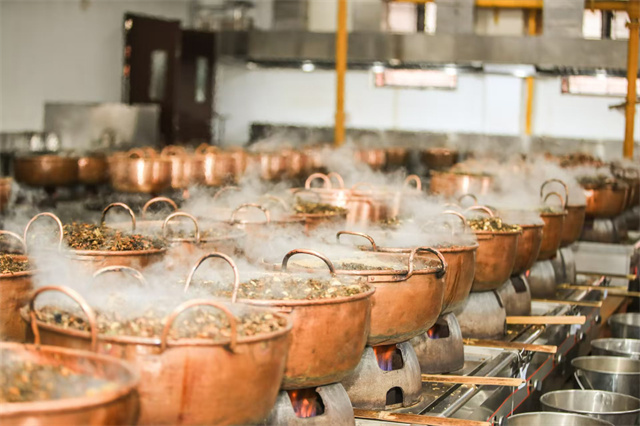 热气腾腾的膏方制作间内,随着浸泡6个多小时的第一批膏方药材正式入锅,100口紫铜锅的炉火熊熊燃烧,经过老药工们的不断搅拌,一阵阵浓郁的药香扑面而来,制作间内的温度一会儿就达到了40℃……今天正值立冬,上海中医药大学附属岳阳中西医结合医院(以下简称岳阳医院)拉开了冬季养生的序幕。