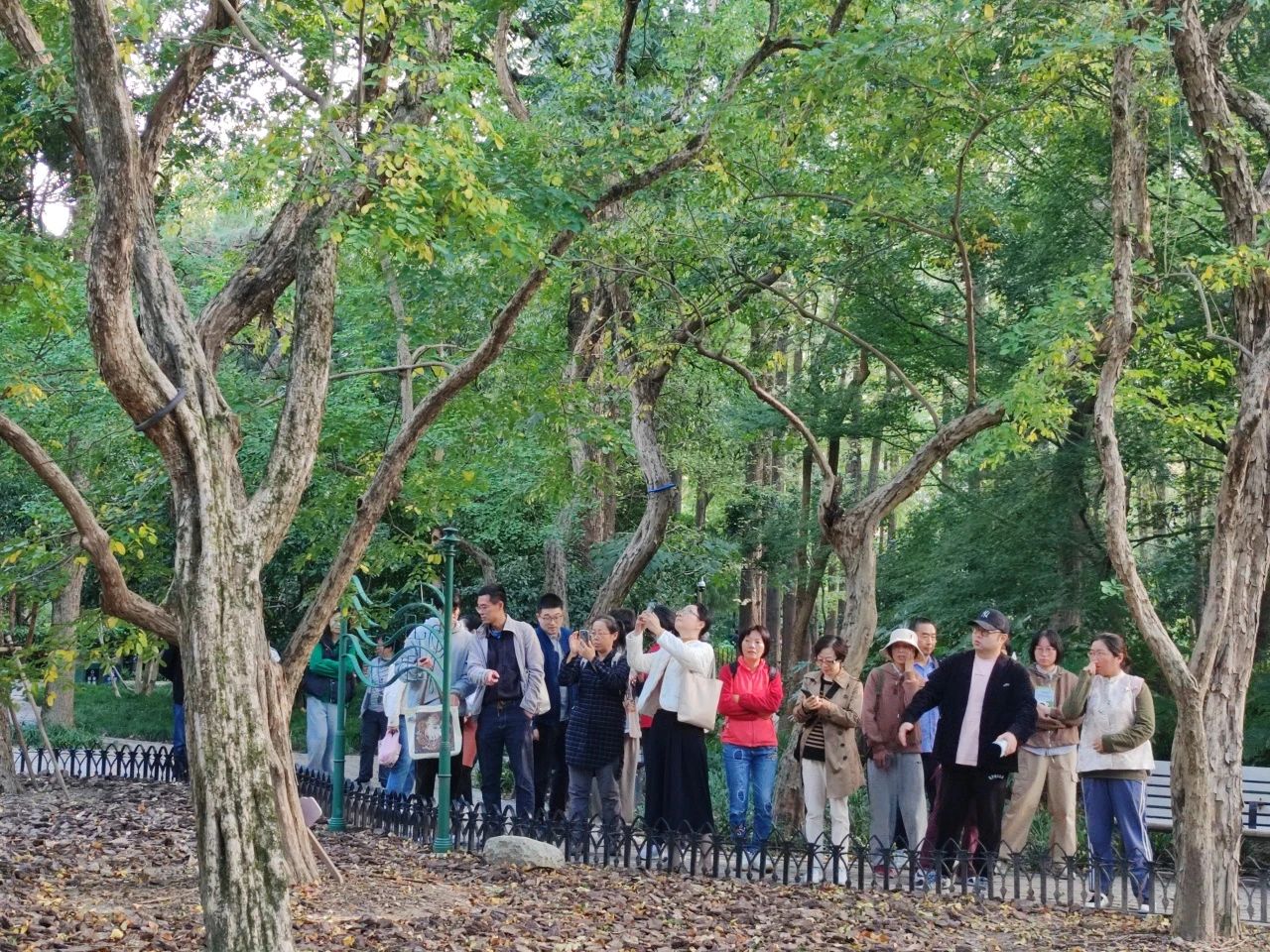眼下,树叶逐渐泛黄变红,果实挂满枝头,正是观赏树木的好时节。活动现场,市民们热情高涨,在绿化高级技师龚超的带领下,沿着中山公园万航渡路一侧,踏上了探寻古树的旅程。一路上,大家欣赏到了朴树的苍劲、黄檀的雅致、罗汉松的奇特、青枫的秀美以及香樟树的挺拔,每一株古树都散发着独特的魅力,让人流连忘返。