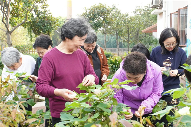 一颗颗小小的棉花种子,在大家的呵护下茁壮成长,最终开出美丽的花朵,结出棉桃。中泾居民区党总支书记金志岚说:“生活在我们中泾的居民基本上都是原土地拆迁的农民,所以我们在建造生境花园时,就想把以前的农作物,比如棉花,再移种到这里来,我们称它为‘中泾棉’。这两年,我们把采摘下来的棉花收集起来做成抱枕,然后送给社区的百岁老人,让他们能回忆起以前的农作生活。”