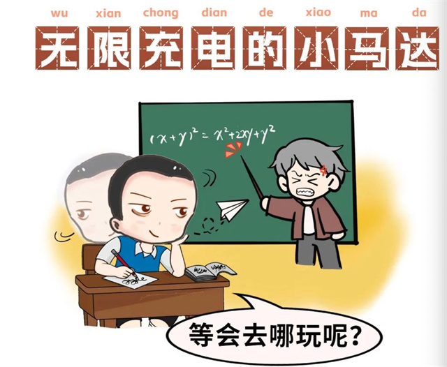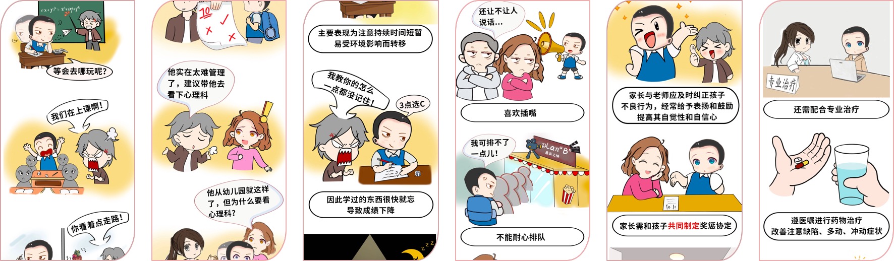 上课时想等会去哪里玩,下课时在走廊里奔跑,成绩一直在退步……《无限充电的小马达》用漫画展现了注意缺陷多动性障碍患者的常见症状。粗心大意、不能耐心排队、喜欢插嘴等,“对父母来说,孩子有这些行为都是需要注意的。我通过小宝这个卡通角色展示了其行为特点和日常挑战,反映他们的心理状态。而综合治疗板块则相对温情,希望更多人了解多动症,让爱无障碍。”顾嘉雯说。