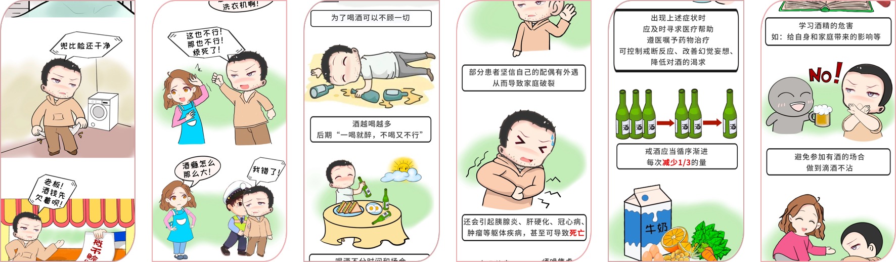 翻开作品《魅惑的迷魂汤》,主人公小宝的一天从“晨起一瓶酒!活到九十九!”开始。前6幅漫画呈现了酒精依赖综合征患者的日常,常逛烟酒专卖店,兜比脸还干净,甚至新买的洗衣机也被搬去回收站换钱,为了喝酒可以不顾一切。这些细节都是护士顾嘉雯在工作中遇到的。“因为漫画内容都基于工作中遇到的真实案例,我有时灵感来了创作会很顺利,绘画过程中更注重患者的表情、症状的真实反馈。”