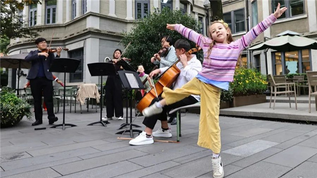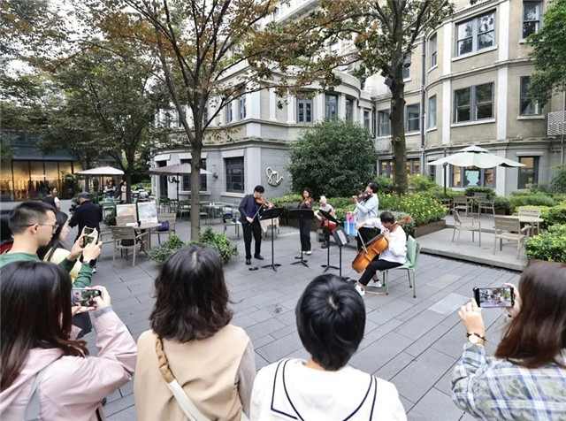 演出当日下午,音乐家们深入衡复音乐街区,在拥有百年历史的黑石公寓里,上演了一场别具怀旧风韵的音乐快闪,吸引众多市民游客驻足。情之所至,现场观众伴随着美好的旋律翩然起舞,香港弦乐团的乐手们也与观众积极互动,即兴加演了《上海滩》等多首香港老歌。