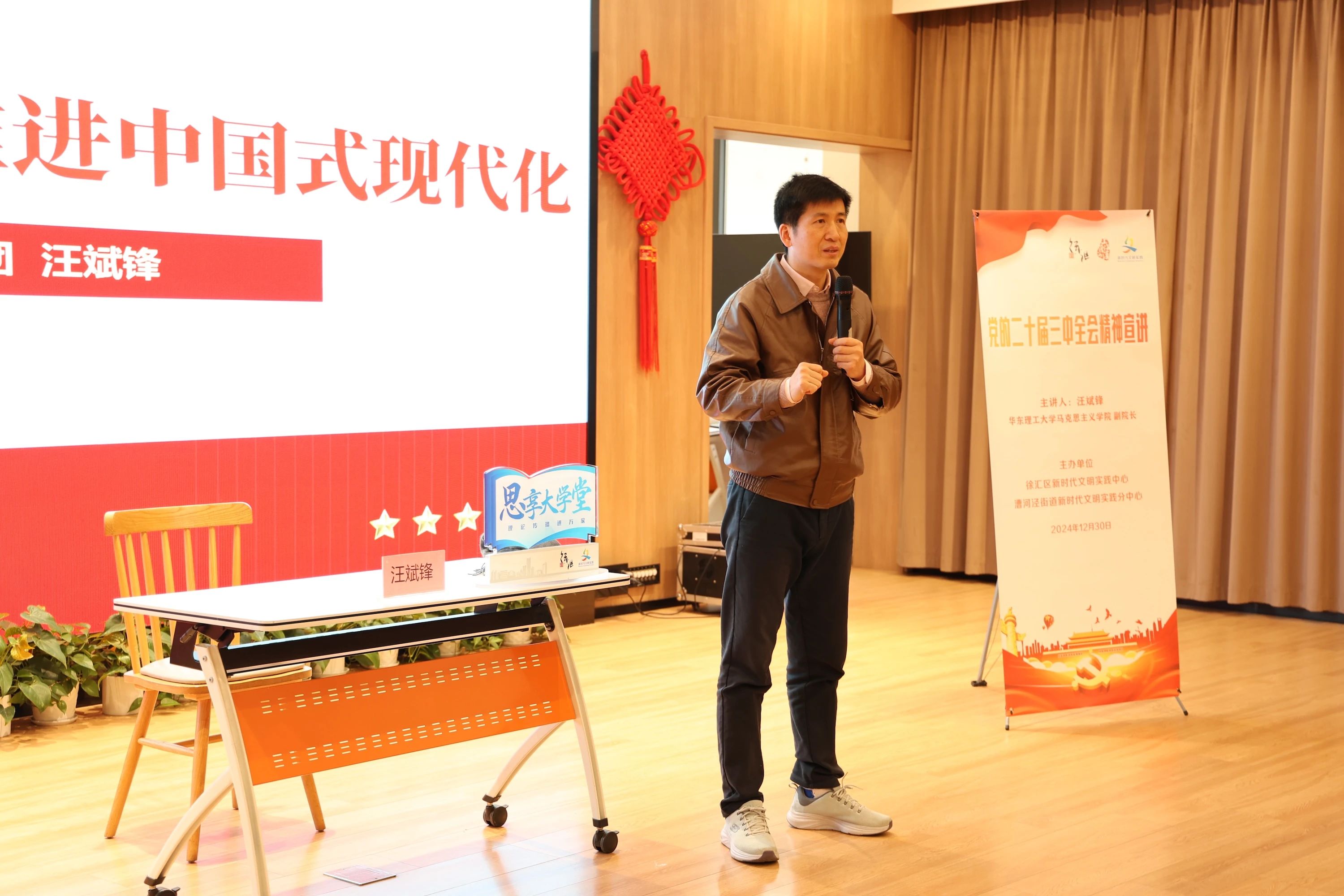此次“思享大学堂”由上海青年讲师团成员、华东理工大学马克思主义学院副院长汪斌锋主讲,他以《进一步全面深化改革 推进中国式现代化》为题,为漕河泾街道华富居民区的党员及社区居民带来党的二十届三中全会精神主题宣讲,现场座无虚席。
