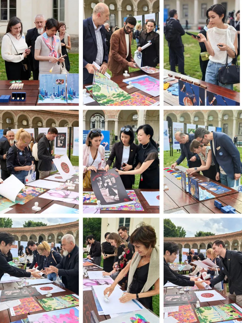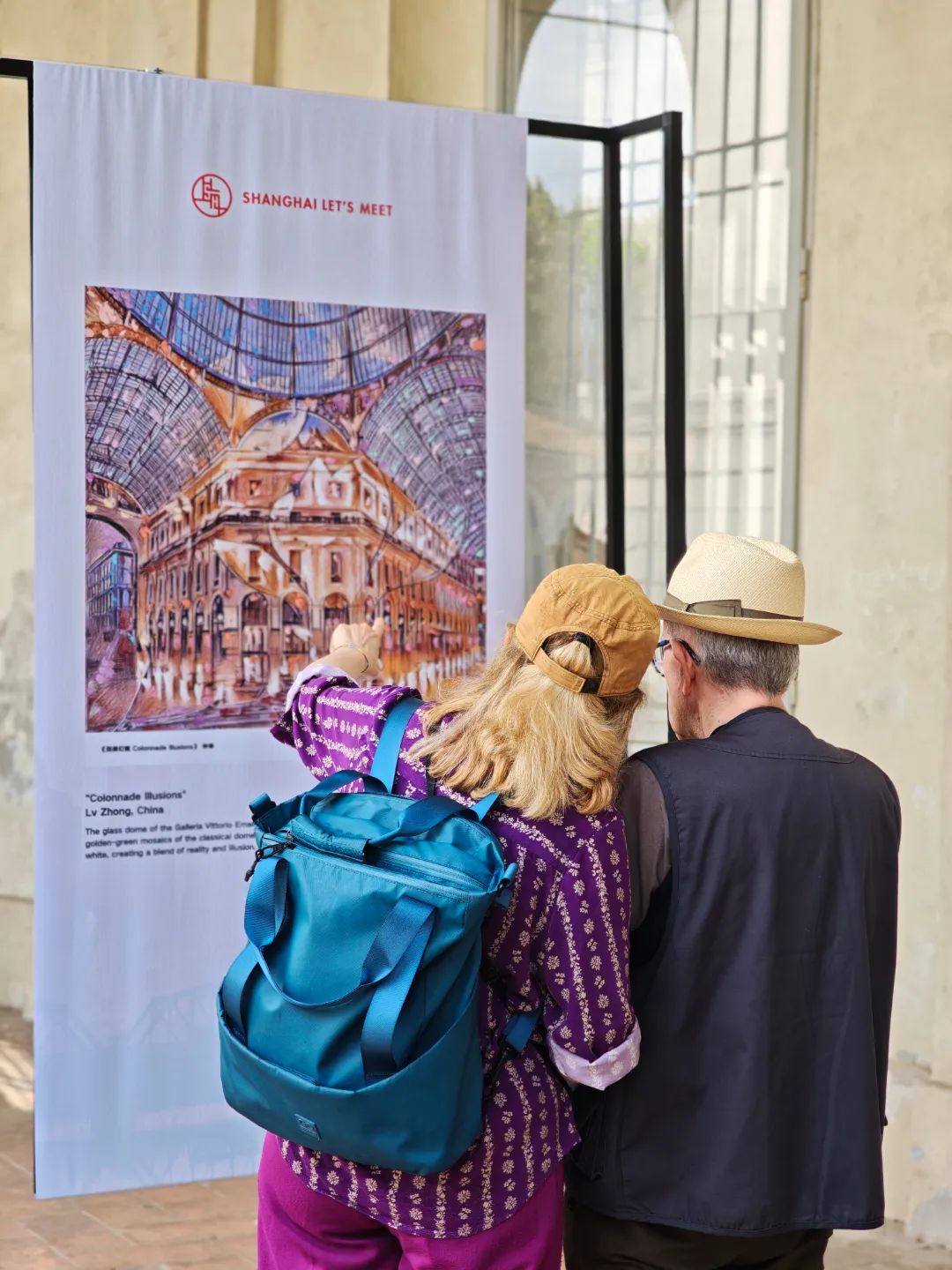 琵琶与小提琴合奏《茉莉花》和《今夜无人入眠》拉开活动序幕,将意式美学与东方雅韵完美融合。巡展呈现了40幅以“上海印象”为主题的艺术作品,来自中国、法国、意大利、日本、新西兰、美国等17位艺术家和设计师创作。其中《江河之吻》创作源于上海与米兰城市地标,成为本次展览的点睛之作。