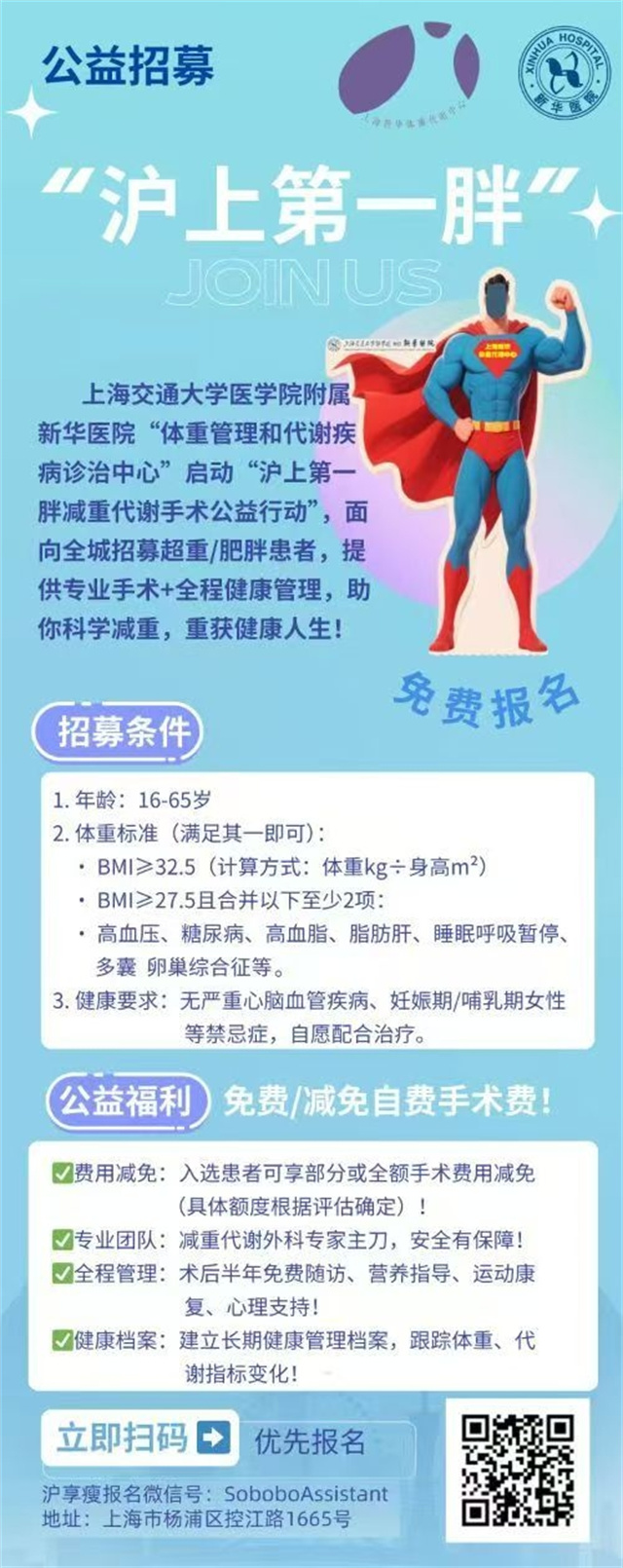从本月起,上海交通大学医学院附属新华医院发布一项公益活动——“寻找沪上第一胖”,该活动面向全城招募超重肥胖患者,为他们提供专业的减重代谢手术及全程健康管理服务。