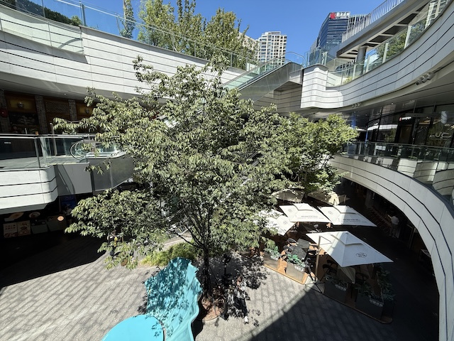 这里一共有4.2万平方米绿地,除了地面的公园,地下商场的走廊、桌椅旁也是布满了绿植,可以说既弥补了苏州河沿线的绿廊空缺,同时也是在市中心打造了一座“森林里的商场”。