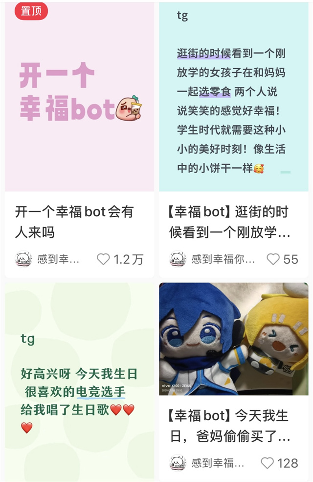 此外,蔡海超强调,幸福日记在网络平台的分享模式也具有特殊意义。以“幸福bot”为例,它并非炫耀,而是一种“分享甜点模式”。当个人记录被一群人看到、分享时,会形成情感共鸣,这种低成本的温暖连接,当下尤其珍贵,为年轻人提供了一种社会心理支持。