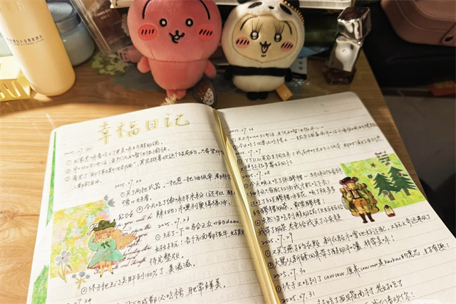 “还记得那是一个很惬意的晚上,我勾选着选择题,同时享受晚风的清凉,既不快也不慢,是繁忙的高考复习中的小小放松。”记录了许多篇幸福日记,18岁的胡欣欣挑选出自己最喜欢的一篇。在写幸福日记半年的时光里,这些温暖美好的小事,为她留下了自己生活的痕迹:“翻开日记,也能回忆起那段时光的点点滴滴。”