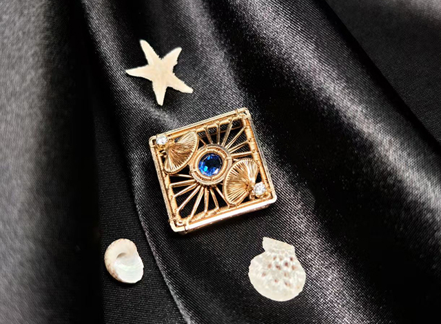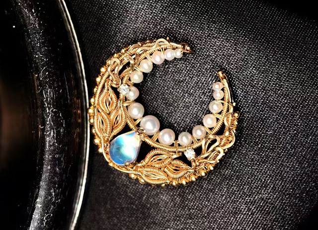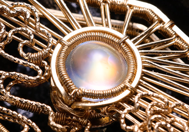 她的原创古典纹饰绕线作品《出袖日月》,“出袖”语出陶渊明“云无心以出岫”,有将日月光华拢入袖中之意。主石采用珠宝级月光石,从不同角度变幻出橙黄色彩,对应旭日与满月。然后将金色批花线缠绕成纹饰,形成动静对比。“纹饰源于宋徽宗《瑞鹤图》中的流云纹,流动飘散,富有灵性。”刘昱辰还特地设计成胸针、吊坠两用款,有不同意境。