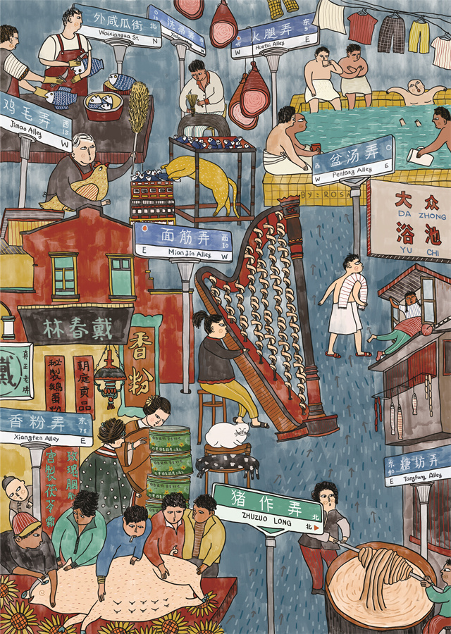 照理说,老南市的有趣弄堂名更多,筷竹弄、猪作弄、面筋弄、火腿弄、鸡毛弄、豆市街、外咸瓜街、引线弄、洗帚弄……如今看来趣味盎然,是因其望文生义,字眼简明扼要,背后的历史呼之欲出。比起南京东路一带所见的里弄路牌,这些老南市的地名更早一步踏上了城市更新进程。陈寒松指出,南京东路附近这些弄堂还原出的历史风貌,并不是传统印象的“十里洋场”,而是老上海独有的市井百态,与老南市一样,见证着中国人自己做买卖的繁荣,可谓是“小弄堂里的大上海”。