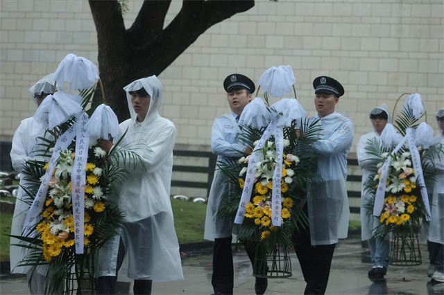 四名礼兵稳稳抬起两个寄托着无限哀思与崇高敬意的花篮,缓步走向就义地,将花篮郑重摆放在刻有英烈名字的碑墙前。全体人员面向就义地深深三鞠躬,无声的敬意弥漫在空气中。