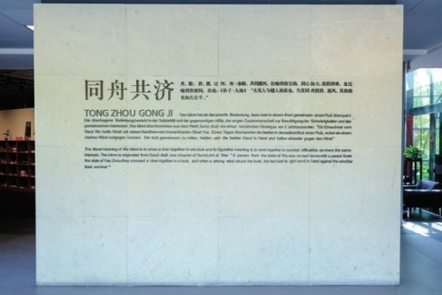 在校史馆内,还有一面“同舟共济”墙。同济大学校名“同济”取自成语“同舟共济”。“同舟共济”最早出自《孙子兵法·九地篇》:“夫吴人与越人相恶也,当其同舟而济,遇风,其相救也如左右手。”寓意“同心协力,战胜困难,共同抵达理想的彼岸”。“同舟共济”后来也被确定为学校校训。