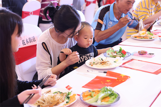 活动以“同祝、同书、同唱、同做、同吃”五大仪式串联全场。浦东各界道德模范、身边好人、城市建设者及市民代表齐聚,以“科技腾飞揽星月”“四海宾朋共庆贺”等诗句抒发爱国情。少儿艺术团领唱《今天是你的生日》,全场挥动国旗汇成红色浪潮,“同做”环节尤为亮眼,市民用番茄酱绘五角星、蔬菜拼出“76”字样,打造“国旗面”“生日面”特色浇头。
