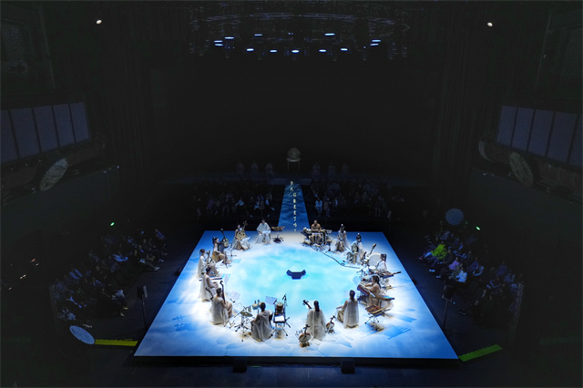 这部自2023年首演便引发业界关注的作品,历经四轮演出形成独特的空间表达。舞台中央,14位演奏家围坐成圆,重构了声部秩序;中心舞台不远处的6位歌者如流动的音符穿梭其间,编织出第一重听觉梦境。二楼看台上,6位鼓手与11位来自中福会少年宫合唱团的纯净童声组成“空中乐团”,与主舞台形成精妙的上下呼应,在剧场中构筑起一座立体的“声音建筑”,拓展了观众对民乐声场的想象。