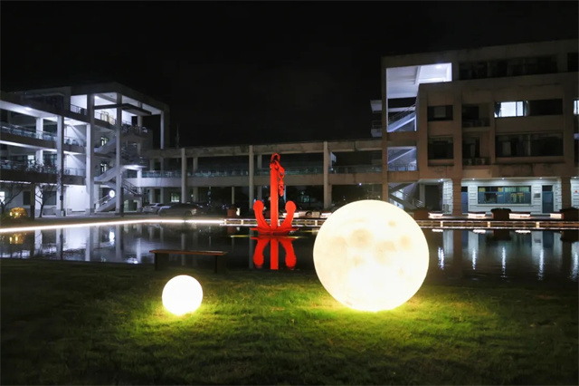 水池旁还新建了一座中式凉亭,幽静竹林与巨大的月球灯共同编织出校园“打卡秘境”,宛如一幅流动的山水画卷。夜幕低垂,太阳能灯温柔点亮小径,月球灯映照水面,倒影摇曳,虚实交错,宛若“镜中月”。这一刻,夜色洇染中庭,喧嚣归于宁静,中秋的氛围越发浓烈。