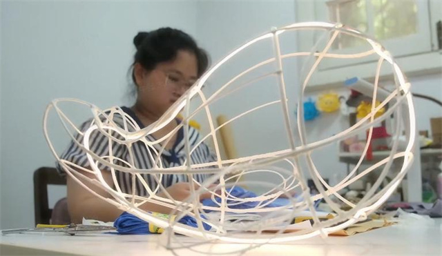 为了更好地还原游戏角色,她反复调整设计稿,用铅丝精准弯出骨架,之后用棉花纸包裹骨架防锈定型,随后以纸钉仔细固定——偏差一点整体形态便可能失真;最关键的是面料,她最终选用轻透的雪纺与涤纶替代传统绸缎,让光线温柔渗透,仿佛鲸鱼自然发光,与游戏中的视觉效果高度契合;最后再细心剪出眼部纹样,一点点粘贴到位。一盏仿佛会呼吸的鲸鱼灯,就这样在指尖诞生。